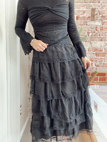 Tiered Chiffon Lace Trim Midi Skirt