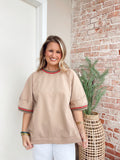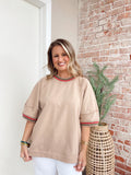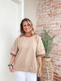 Sweatshirt meets designer vibes. This short sleeve sweatshirt is perfect for those days that you want to be comfy, but still fashionable. Pair it with some white jeans, sneakers & jewelry and you're good to go! The colorful bands on the sleeves and neck are just the perfect touch.