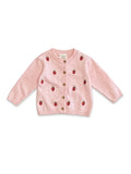 This adorable and detailed organic cotton knit cardigan with all-over strawberry embroidery on the front.