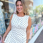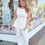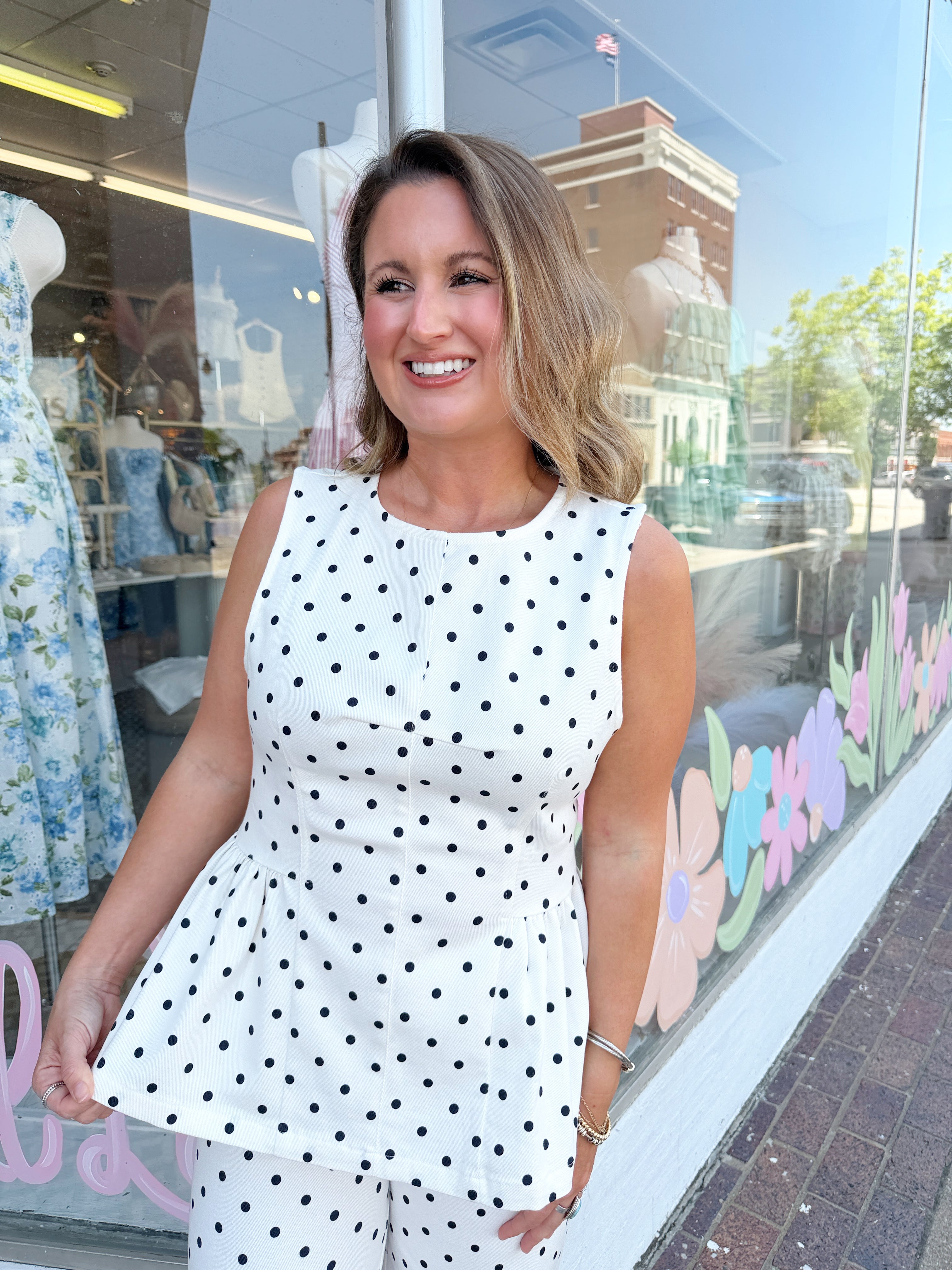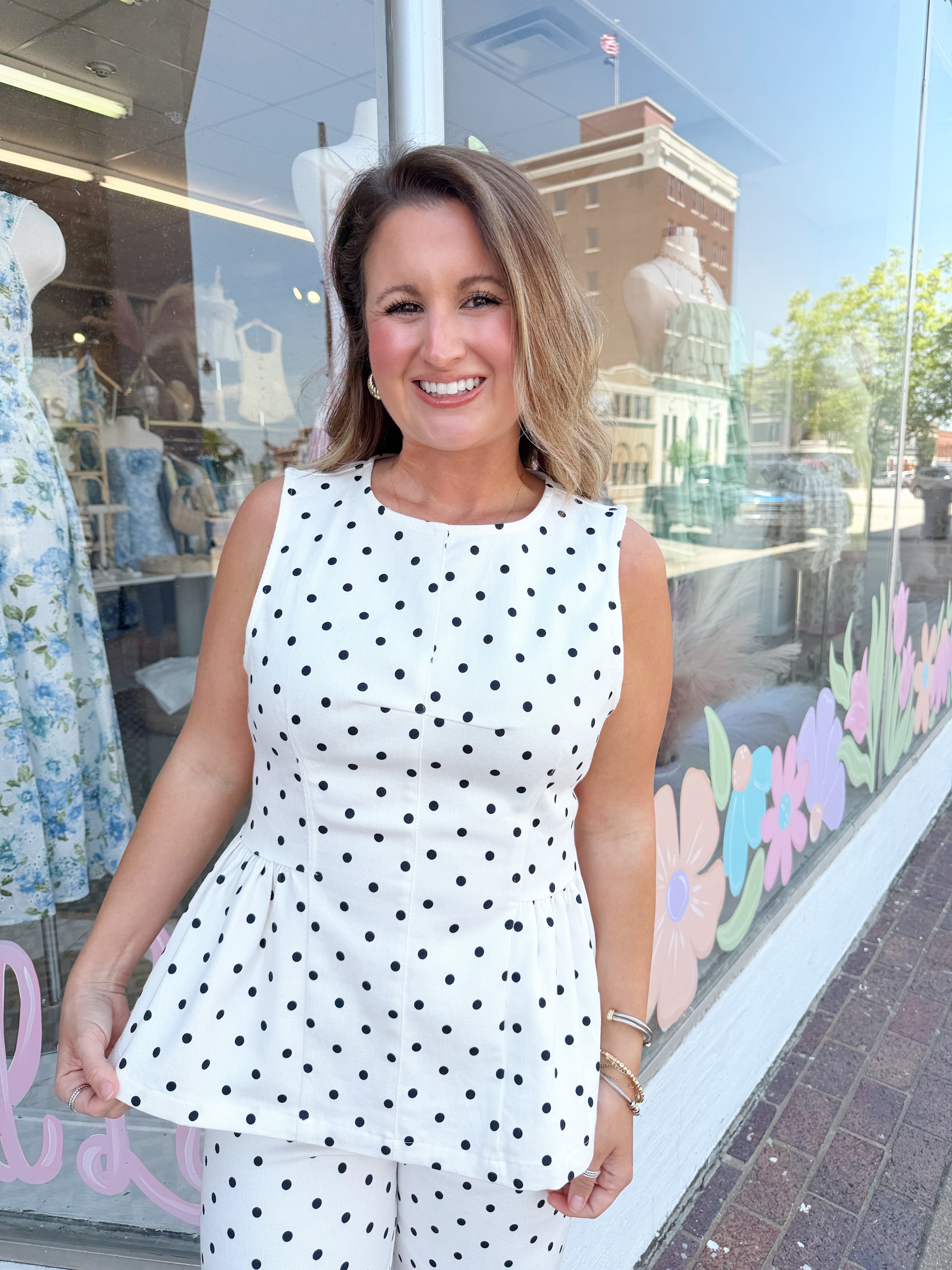 The sweetest little denim polka dot set! The peplum style top is so fun and flirty, and the pants are the perfect tailored fit. Wear together for a stand out look, or wear separately.