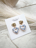 . blue and white printed heart earrings. Gold post
