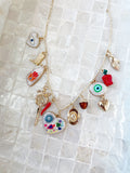 Multi charm necklace: hearts, evil eye, boots, peppers, etc.