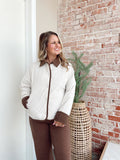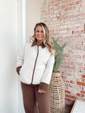 Solid long sleeve quilted jacket featuring corduroy collar and contrast binding. Snap button closure at front. Side pockets. Lined. Woven. Non-sheer. Medium weight.