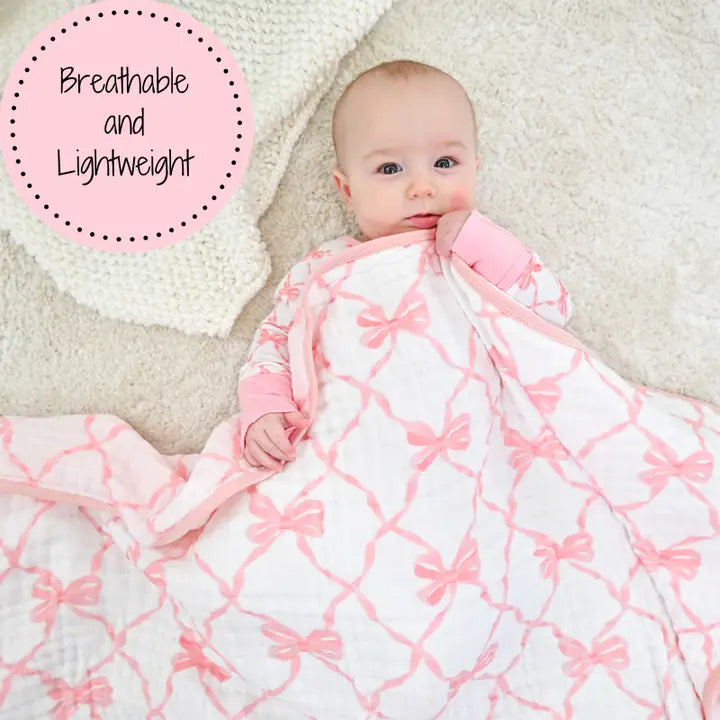 WARM AND SNUGGLY BLANKETS - Cuddle up with a LollyBanks 100% cotton 6 layers muslin quilt to make your baby warm even on the chilliest of winter days or those cool summer nights. Each 47x47 blanket is the perfect size to keep with your newborn through their toddler years. PRETTY PINK BOW - This girly bow print is perfect for keeping in the nursery or using as a stroller cover for your baby. Moms and dads will love receiving these as a baby shower gift or welcome present. FADE RESISTANT AND LIGHTWEIGHT - This quilt is machine washable and able to be tossed in the dryer.