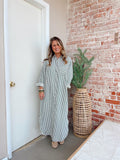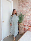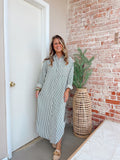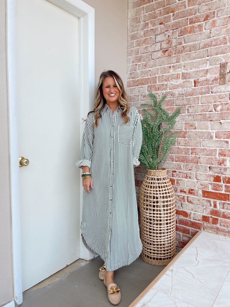 The perfect maxi dress for all occasions! So easy to dress up for work- throw on some flats or mules, gold jewelry, and a nice bag and you're ready for the office! Or pair with some sneakers, trucker hat and you're ready for a playdate or outting with the kids! The pockets, fully functioning buttons, and rolled up sleeves are the perfect details.