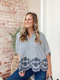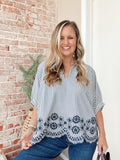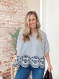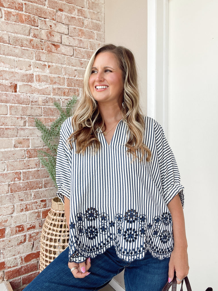 Striped short dolman sleeve top featuring split neckline and floral embroidered scalloped hem. Unlined. Non-sheer. Woven. Lightweight.