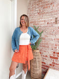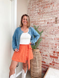Wearing this skirt will ensure you have the cutest outfit at the tailgate! It’s actually a skort- so it’s perfect for gamedays! The braided detail along with the wrap style is such a fun unique touch!
