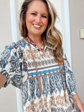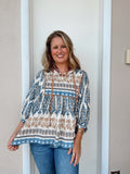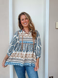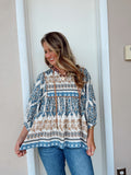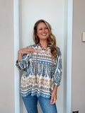 This print is just gorgeous! Loving the blue and tan color tones for fall. The sleeves, v neck, and flowy shape of this top make it perfect for all body shapes!