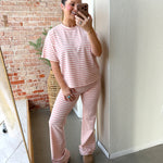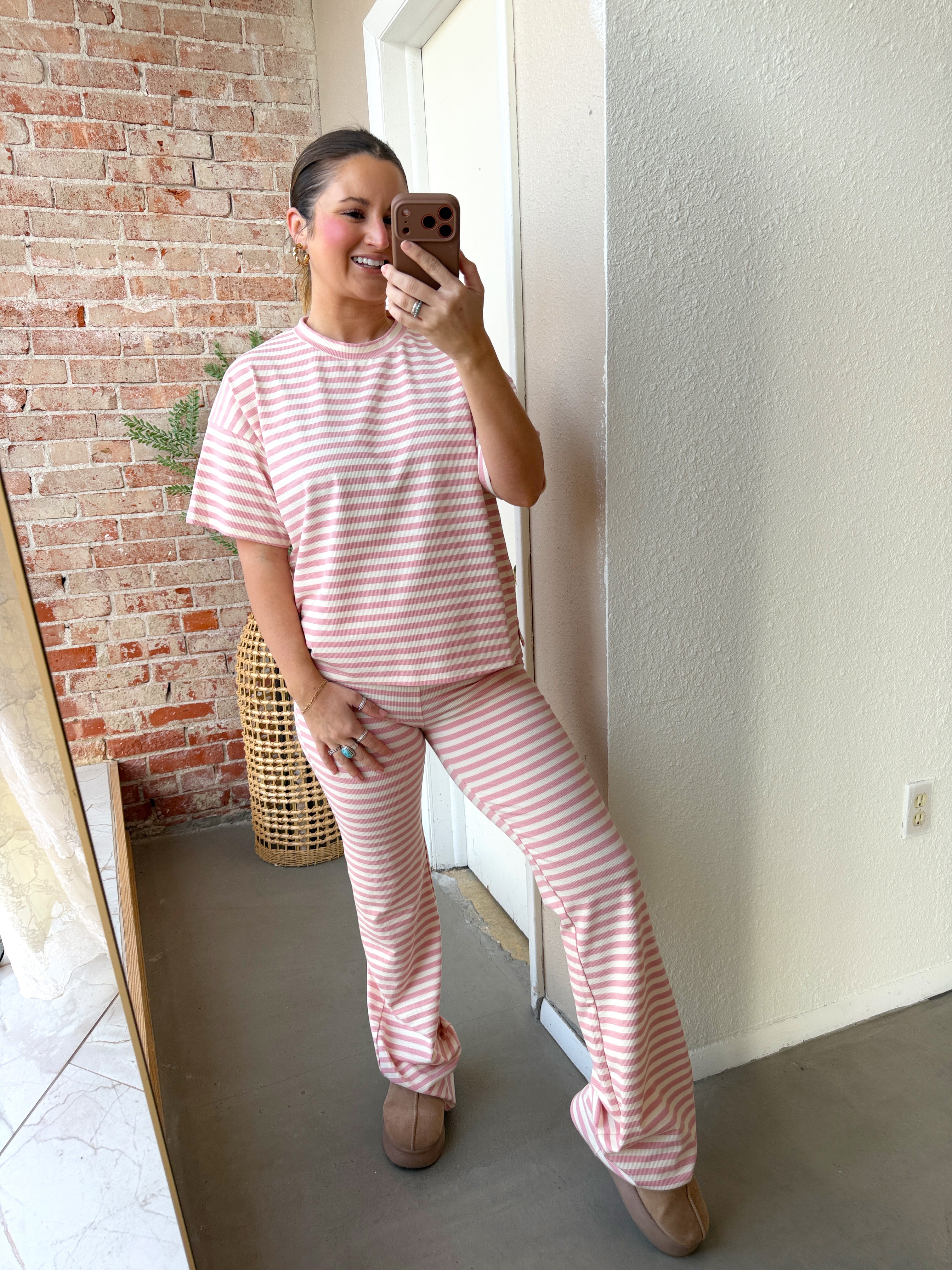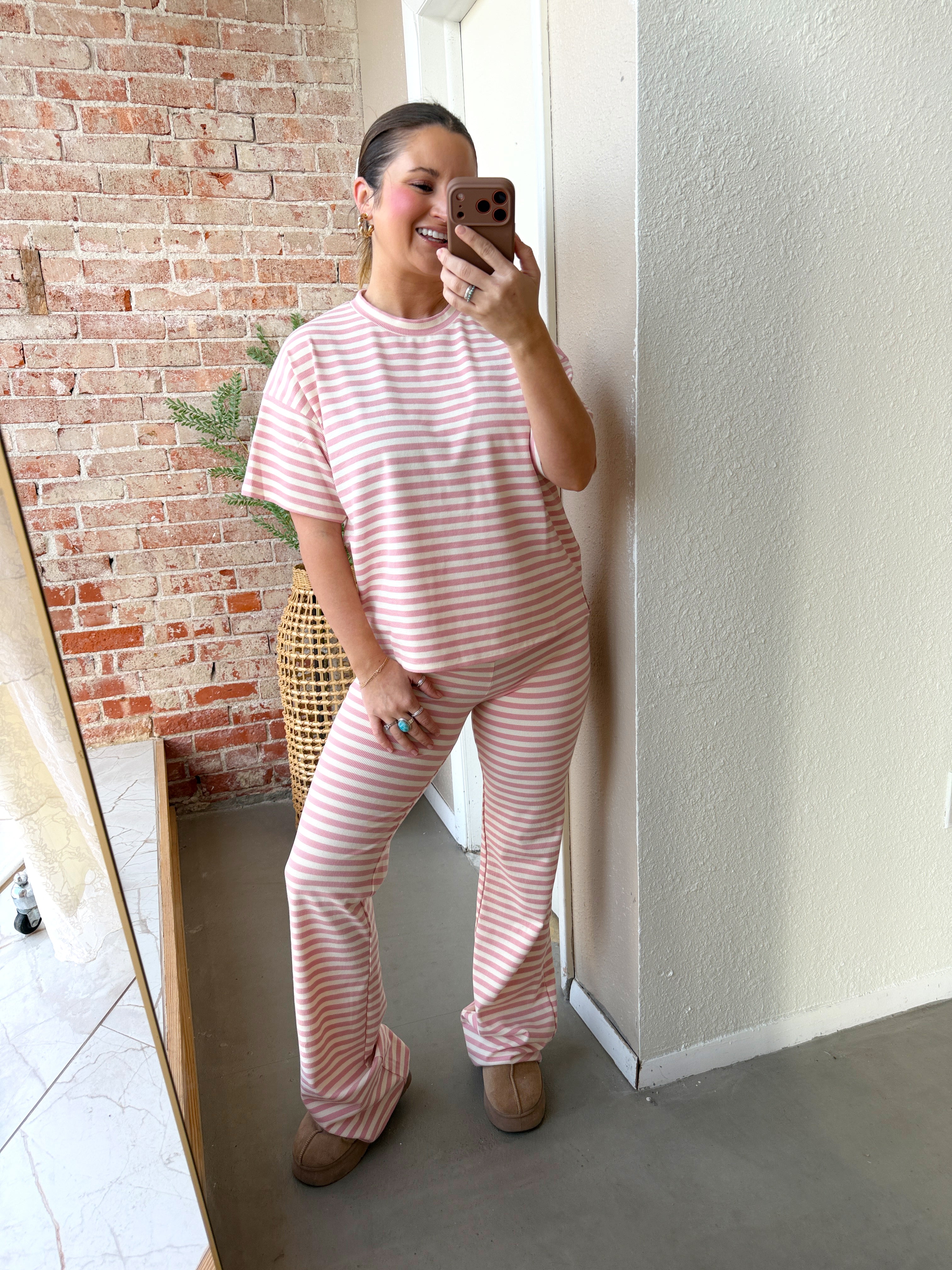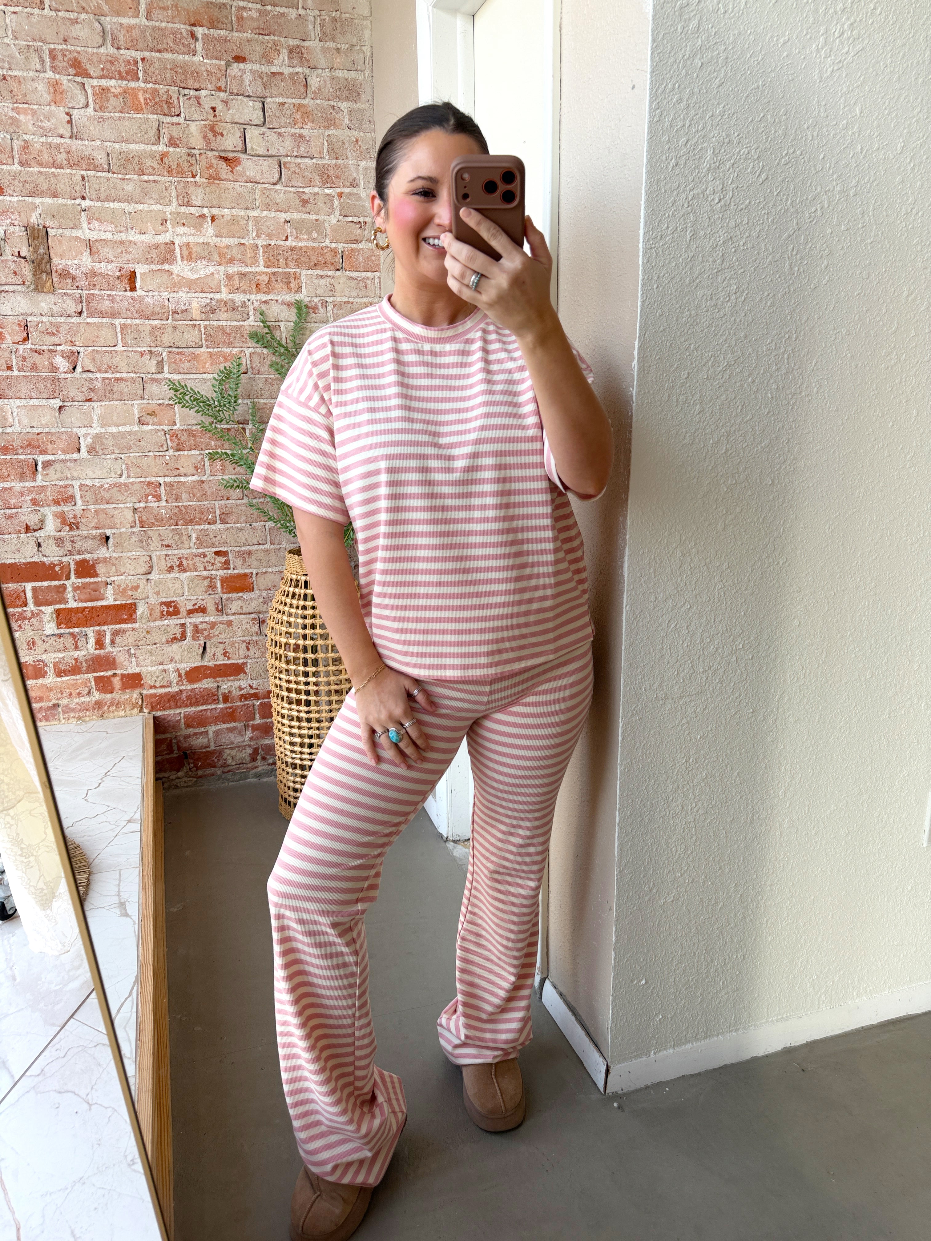 Striped sets are SO in and this one is perfect! Pink and cream stripes, ribbed material, and the perfect fit. both pieces have just the right amount of stretch to them to balance the cute but comfy combo.