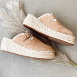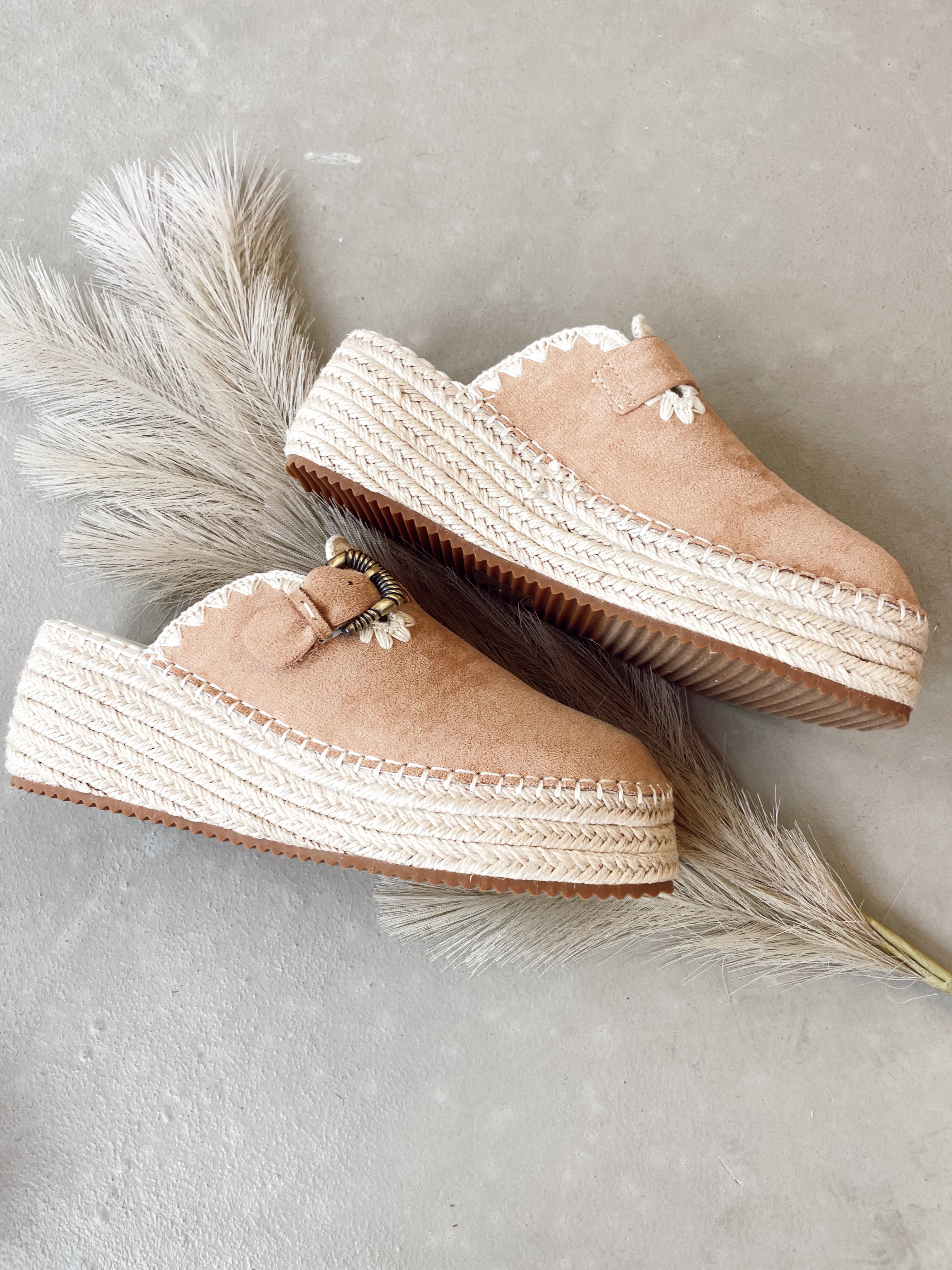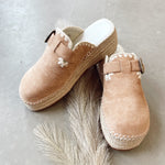 Almond color spring clog, raffia wrapped, western buckles