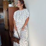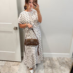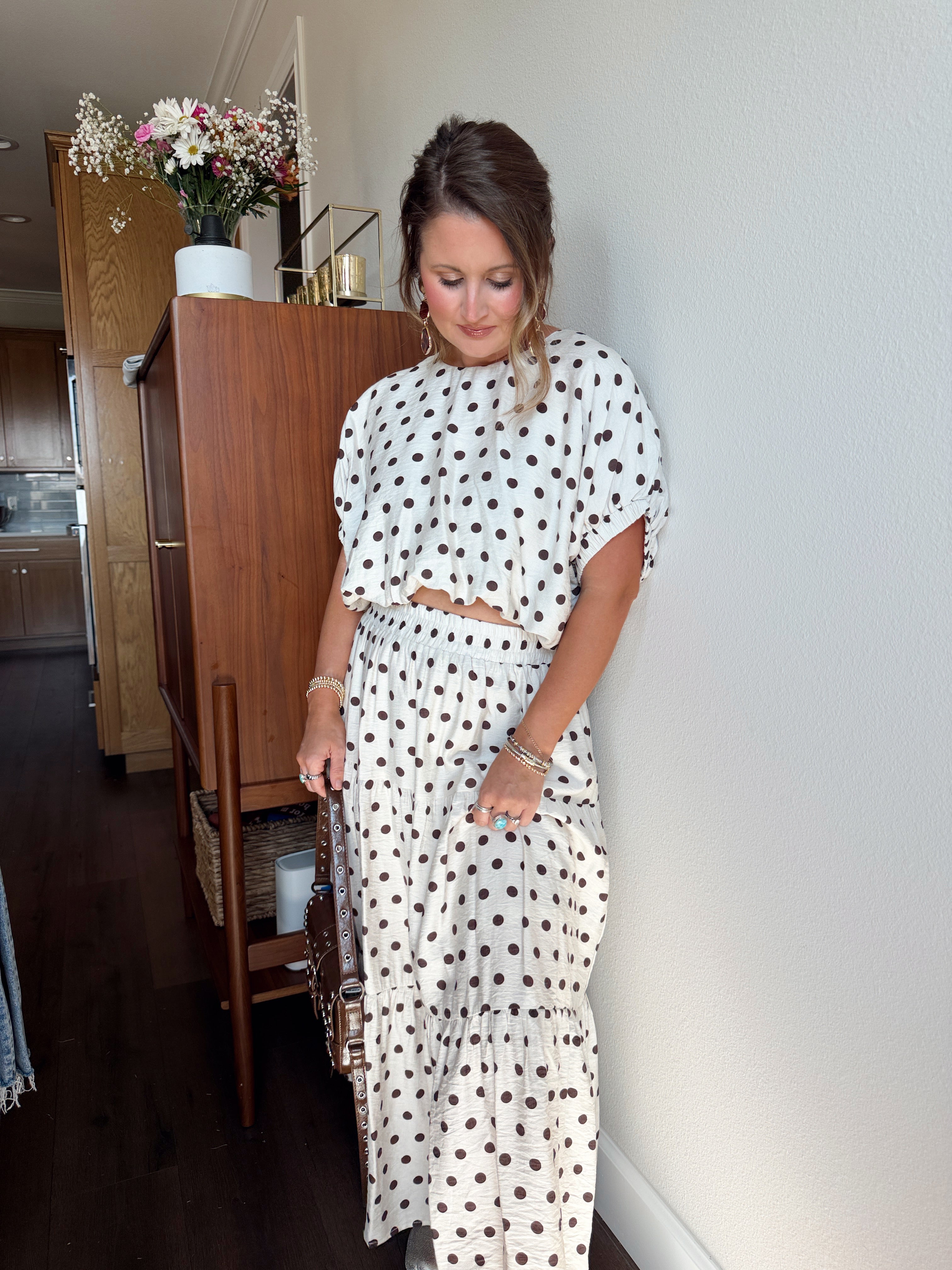 Polka dots are the moment! This set is such a fun and flirty outfit. If you don't like to show your midriff, wear the skirt high waisted and the top regular length. If you like to show a little skin, make the skirt low rise and tuck the top up!