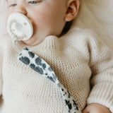 Offering the ultimate blend of fashion and function, our unique Binky Clip features a premium knit strap lined with absorbent fleece to help soak up drool. Simply attach baby's pacifier or teether to one end, then fasten the clip to clothing, blankets or baby gear. Oh, and by the way our set includes three Binky Clips to keep with you wherever you go - no more floor drops or pacifier pick-ups!
