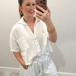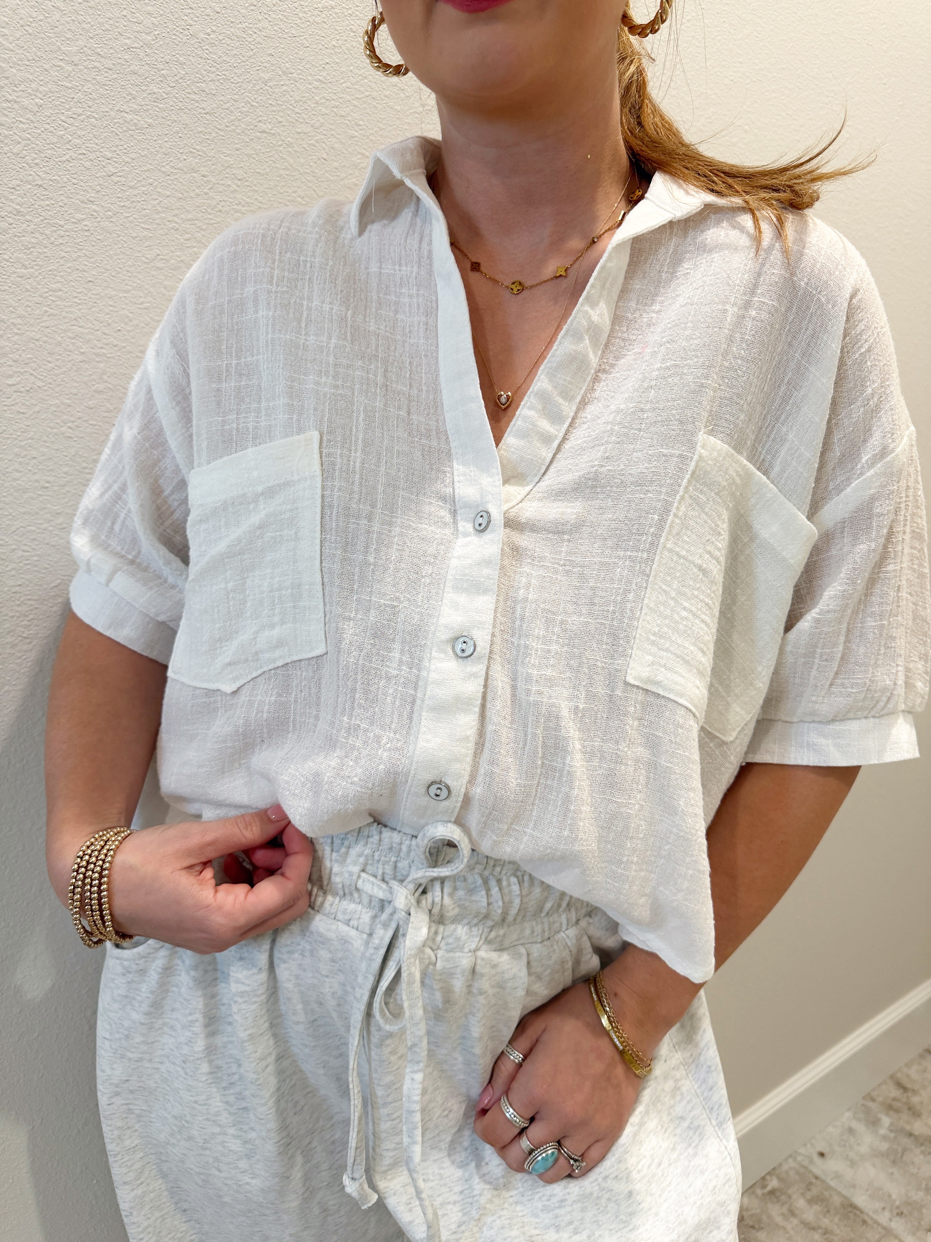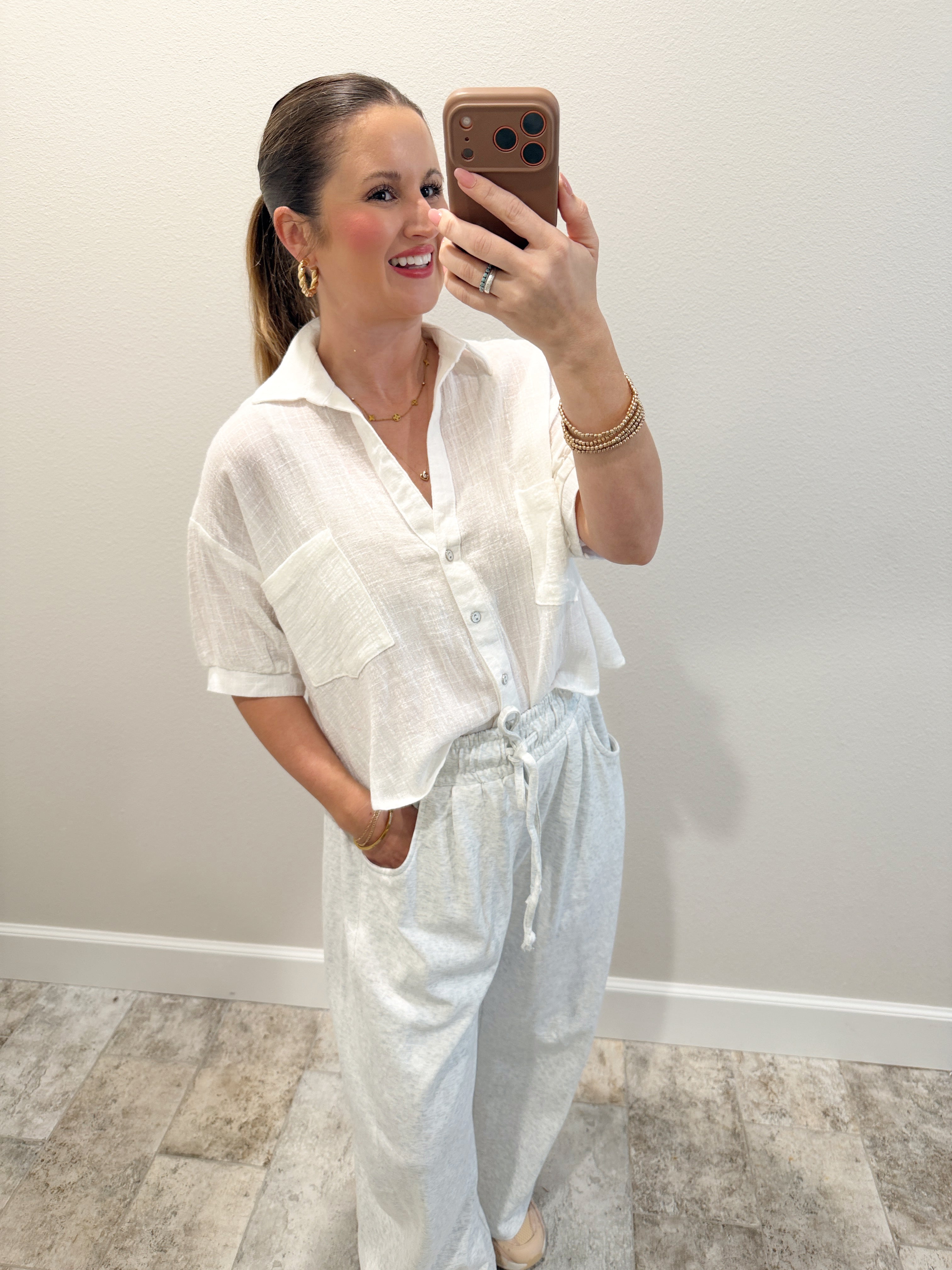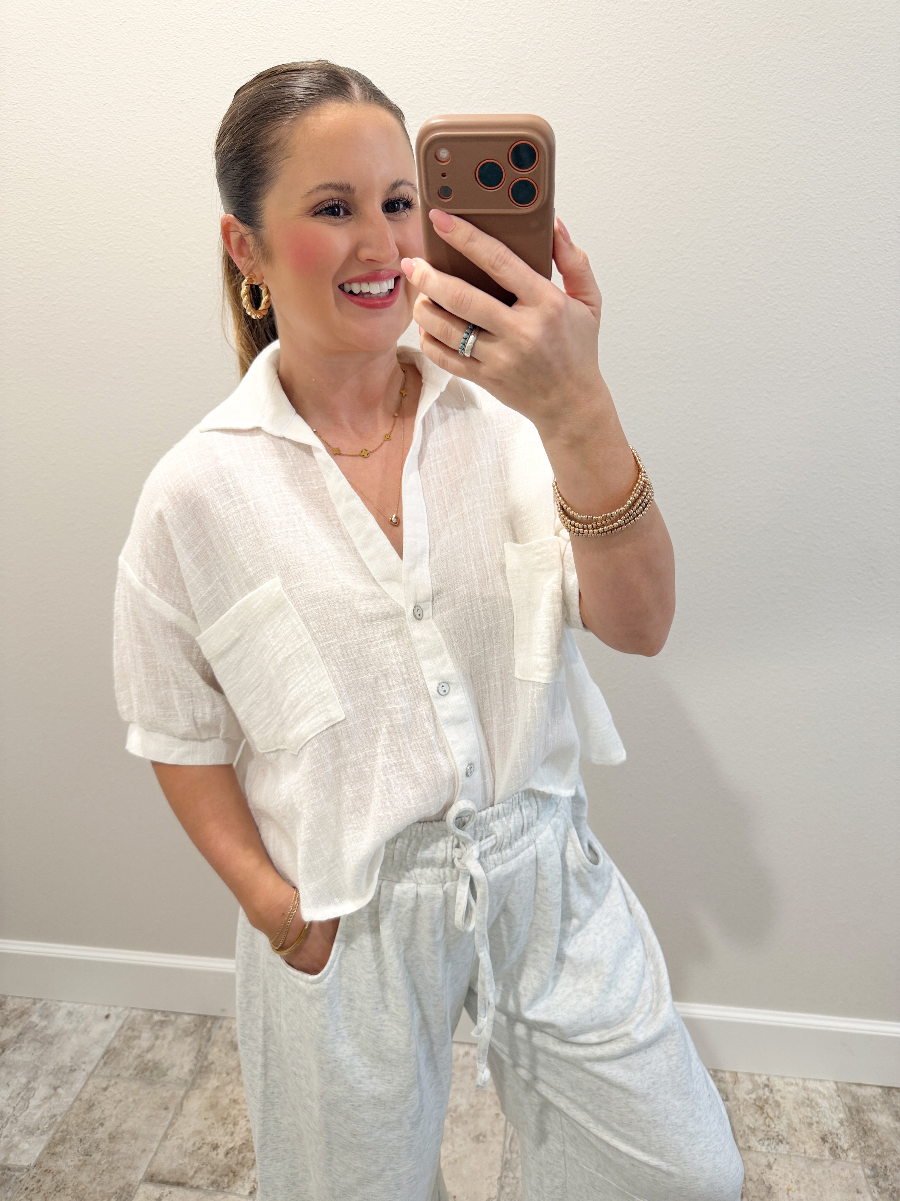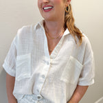 Everyone needs a top like this in their spring wardrobe! A simple, lightweight white top is so versatile. Throw it on over your swim suit like a coverup. Pair with your favorite denim shorts and sandals for the perfect vacay look. Or dress it casual like I did and make it your new everyday top!
