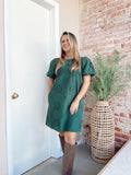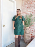 True pine green with ornate detailing. Bubble short sleeves. SO perfect for the upcoming season & holidays!