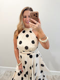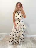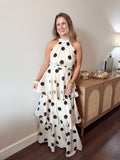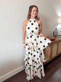 STAND OUT in this amazing polka dot set. Make a statement at your next event in this set. Halter style tank paired with a flowy ruffle skirt. The quality is also a 10/10!